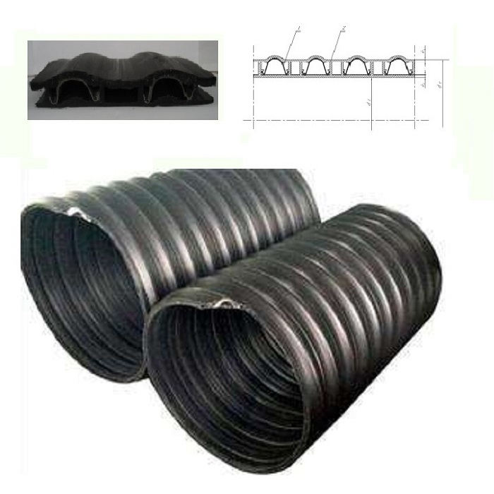 中空壁塑鋼纏繞管是以中空聚乙烯(PE)板帶為基體,用“Ω”形狀的鋼骨架為主要支撐結(jié)構(gòu),生產(chǎn)管道鋼骨架原材料為鍍鋅鋼帶,采用纏繞成型工藝,經(jīng)加工制成內(nèi)壁平直光滑,外壁呈波紋狀的中空壁塑鋼纏繞聚乙烯管道(簡稱:“HWPSP”管道)